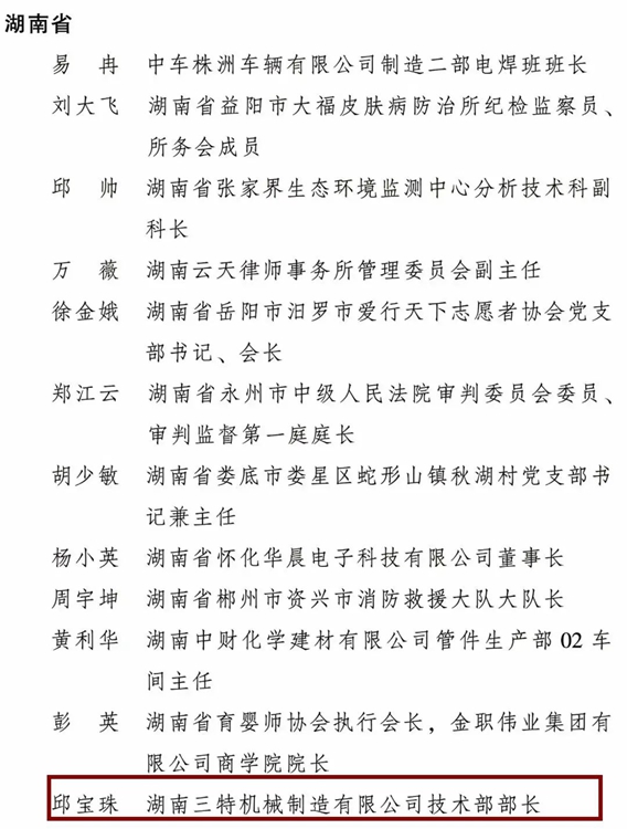 為表彰先進、樹立榜樣,進一步引領和激勵廣大婦女堅定不移聽黨話、跟黨奮進新征程,豪情滿懷、意氣風發(fā)投入推進中國式現(xiàn)代化的偉大實踐,日前,全國婦聯(lián)決定授予10人全國三八紅旗手標兵稱號,298人全國三八紅旗手稱號,授予199個單位全國三八紅旗集體稱號,其中,來自桃源的湖南三特機械制造有限公司技術部部長 邱寶珠 獲得全國三八紅旗手榮譽。